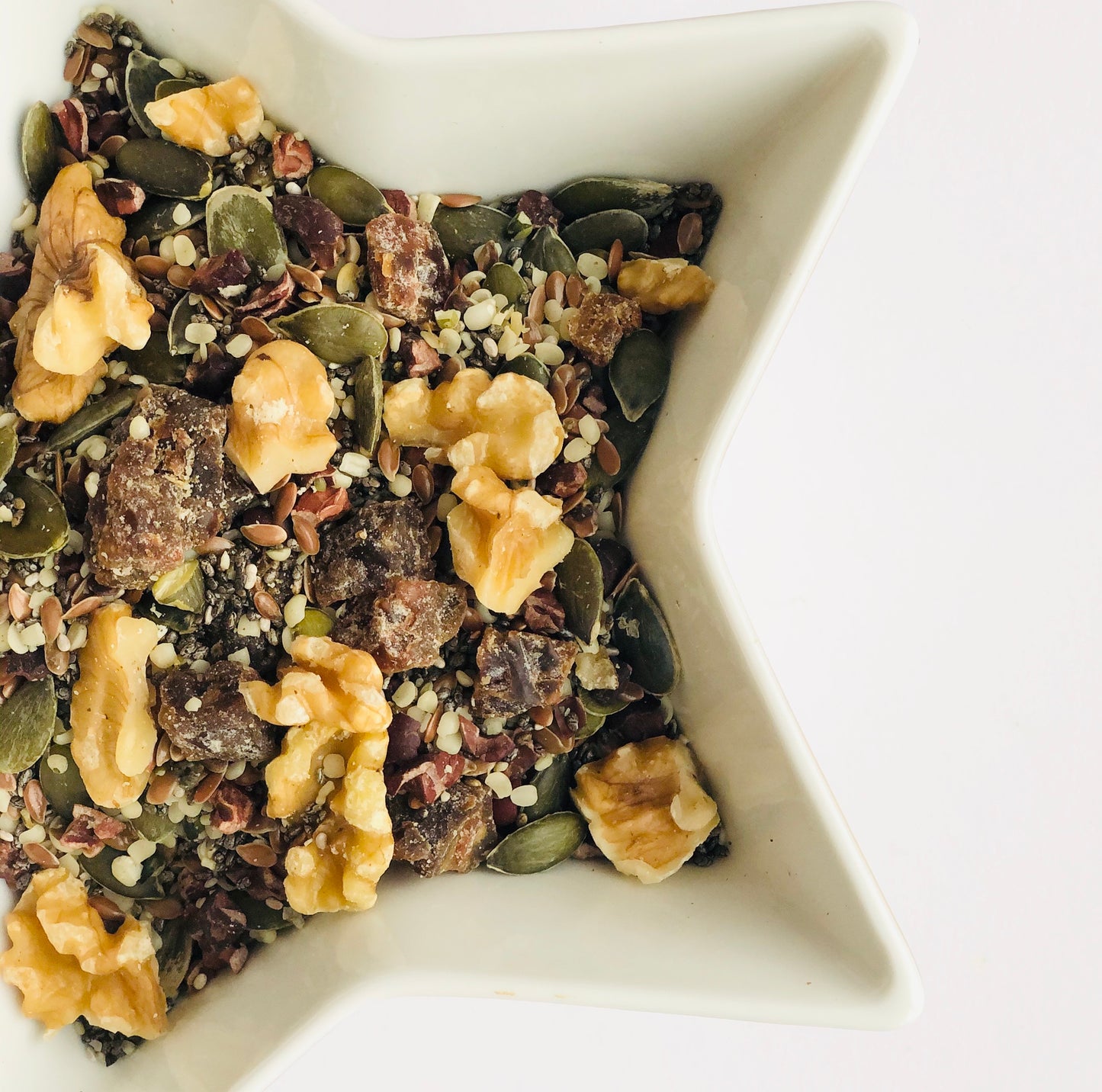 A finely tuned mix of chia seeds, hearty hemp seeds, funky flax seeds, pumpkin seeds, sweet dates, walnuts, cracking cacao nibs and turmeric. For allergens, see ingredients in bold.